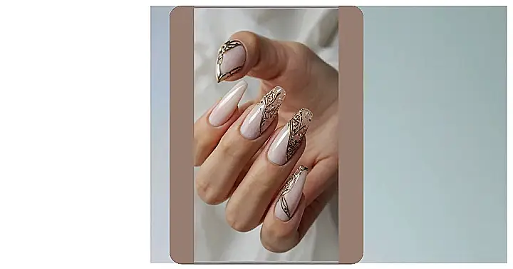 Check out these nails! They’ve got that super pretty light pink base, which is like the chill friend of nail colors – it just works with everything. But then BOOM, you get this awesome golden swirl situation happening, like tiny fancy crown jewels decided to live on your fingertips. They look seriously classy, the kind that makes you feel like you should be holding a tiny teacup or signing autographs, but still totally normal for grabbing snacks or typing out that essay you might have forgotten about.