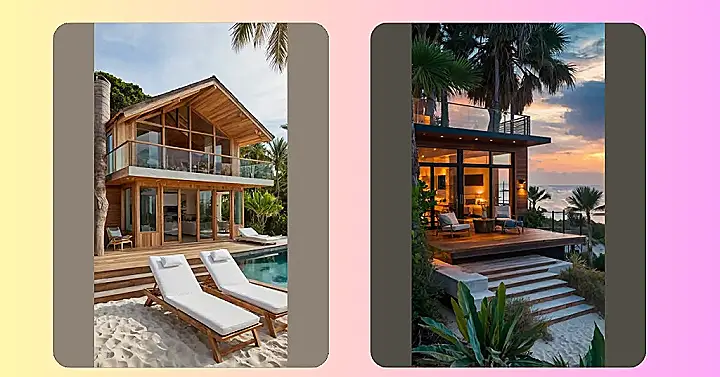 Now, let’s talk about that smart beach house design! See how it’s lifted up on stilts? That’s not just for show; it’s like giving your house a permanent high-five to the rising tide and making sure your flip-flops don’t float away during a storm. Plus, it creates a perfect hideout underneath for when the sun’s too much. It’s built tough to handle beach life, but still looks super inviting, making it the ultimate hangout spot where the biggest decision is whether to swim first or nap on the porch swing.