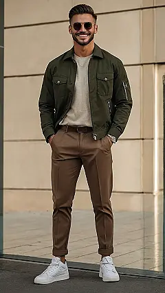 Want to look effortlessly cool like you just stepped out of a magazine? Check out this dude’s outfit! He’s rocking the ‘gents casual’ look with an olive green sweater and khaki pants – it’s like a sophisticated version of your comfy weekend clothes. Plus, those white sneakers are clean and simple, which means you can probably get away with wearing them even if you accidentally stepped in something gross on the way to school.
