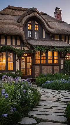 This house is like something out of a fairytale! It’s got that cozy, storybook cottage vibe going on, with its thatched roof and charming stonework. You can almost picture a friendly gnome peeking out from behind the bushes or a fluffy cat napping on the doorstep. It’s so cute, it’s practically illegal! The warm glow from the windows makes it look like the perfect place to curl up with a good book and a mug of hot chocolate on a chilly evening.