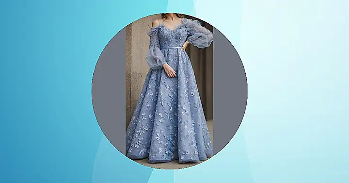 Whoa, look at this dress! It’s like something a fairytale character would wear to a ball, right? That soft blue color feels so light and airy, and those little flowers sprinkled all over make it look totally magical. Plus, check out those puffy sleeves – they’re definitely making a fashion statement! Wearing something like this would make you feel instantly fancy, maybe even like you have secret superpowers hidden in all that flowy fabric. It’s got a real “wow” factor that just grabs your attention.
