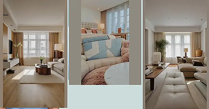 With a super cozy couch, a super comfy rug, and even a super stylish lamp, this room is basically a dream come true for anyone who loves to relax. It’s got that perfect balance of modern and cozy, which is like the best of both worlds! The light wood floors add a touch of warmth, and the big windows make you feel like you’re part of the outside world. This room is the ultimate chill zone!
