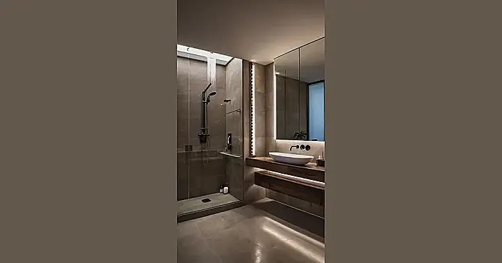 This bathroom is so fancy, it’s practically a spaceship for washing your face! Seriously, look at those walls – they’re like something out of a futuristic movie, but way more stylish. You could totally impress your friends by saying you have a “cutting-edge” bathroom (pun intended!), complete with what looks like a super-secret doorway to another dimension.