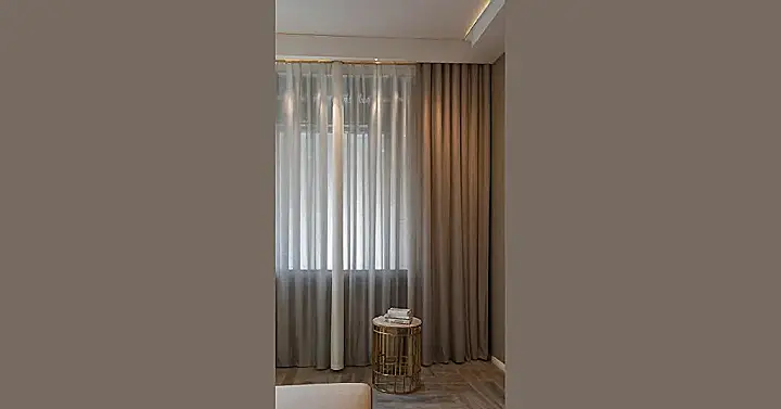 These curtains are like the ultimate wingman for your living room. They’re all, “Hey sunlight, yeah, you’re cool, but let’s keep things chill and mysterious in here.” Think of them as the bouncer at the hottest house party, deciding who gets the VIP treatment of full-on brightness and who needs to take a breather in the shade. Plus, those beige outer curtains look ready to start a spontaneous dramatic monologue at any moment.