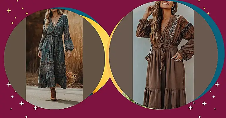 This outfit is like a dream come true for a cool, breezy autumn day! The flowy dress, with its pretty floral print and cool colors, is just begging to be twirled in. It’s like wearing a comfy blanket that’s also super stylish – who wouldn’t want that? The cold-shoulder design adds a little bit of edgy flair, and the delicate jewelry is just the perfect finishing touch. You’ll be the boho queen of fall in this look!
