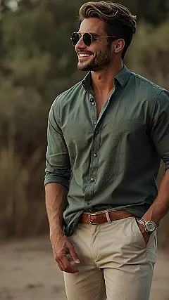 This guy’s outfit is pure perfection! He’s rocking a look that’s both stylish and comfortable – the kind of outfit you could wear to a fancy event or just hanging out with friends. It’s like a secret weapon for looking good without even trying too hard. That olive green shirt is super versatile, and those khaki pants? They go with practically anything! The whole look screams “I woke up like this…looking amazing.”