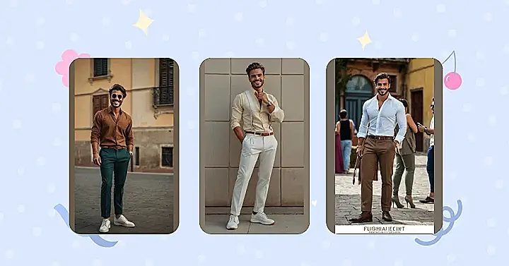 Want to look like you just stepped out of a movie set in Italy? This guy’s got the style game on lock! Check out how he mixes a cool, earthy brown shirt with those awesome green pants. It’s like he raided a forest and a chocolate factory, then put it all together in a seriously stylish way. Those shades and the smile? Bonus points for looking effortlessly cool, like he just knows he’s rocking this whole “Italian fashion” thing.