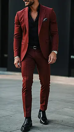This Christmas, ditch the reindeer sweater and step into some serious style! Check out this burgundy suit – it’s like a Christmas tree, but way cooler. Forget flashing lights, this outfit is all about sophisticated shine. Pair it with some slick black shoes and you’ll be the best-dressed guy at the party, guaranteed to steal the spotlight (and maybe a mistletoe kiss!).
