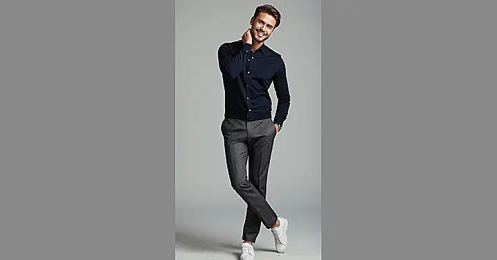 Looking good for a business meeting used to mean squeezing into a suit that felt like it was made of cardboard. But check out this guy! He’s rocking a long-sleeved polo shirt and comfy-looking pants with sneakers, proving you can totally nail ‘men’s business outfits’ without feeling like you’re about to give a stuffy presentation on quantum physics. It’s like the fashion gods decided comfort should finally make a comeback in the workplace, letting you look professional enough to sign important papers but also ready to chase down the ice cream truck if it goes by.