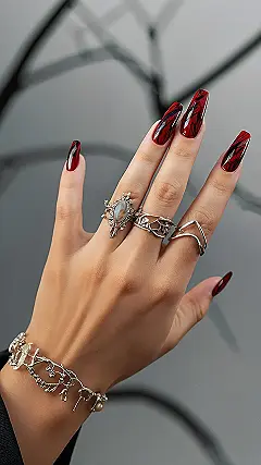 This image is giving major fall vibes, and the nails are definitely the star of the show! They’re like tiny works of art, with that gorgeous red color and the cool black swirls, making them look extra edgy and glamorous. It’s like the perfect mix of bold and elegant, and it’s totally inspiring to see how a simple color can be so impactful. And let’s not forget about the rings! They’re like little pieces of nature, with their delicate designs and pretty stones. It’s clear that this person knows how to accessorize and rock those fall trends, making them look like a total fashionista.