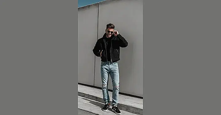 Pulling on a pair of black ripped jeans like these with a cool jacket and sneakers is like instantly upgrading your look from “just okay” to “where’d he get that?” It’s the go-to uniform for looking sharp without looking like you’re trying too hard. This kind of simple, cool men’s streetwear outfit just feels easy and ready for whatever the day throws at you, whether it’s hitting the skate park or just hanging with friends.