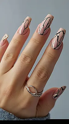 Whoa, check out these nails! Forget geometry class, this is real-world shapes right here. It’s like someone took a black marker, scribbled on a nude base, and then said, “Hold up, let’s add some gold!” Honestly, it looks fancy and cool. You could totally rock this at school, a party, or even just to flex on your friends during study group.