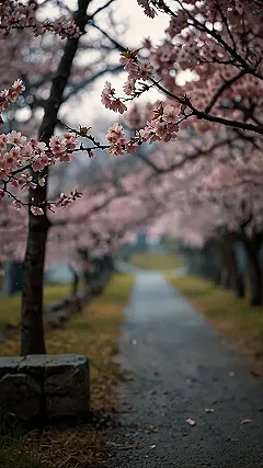 Imagine strolling down a path so pretty, it looks like a painting! Pink cherry blossoms are everywhere, like fluffy cotton candy clouds blooming on trees lining the way. It’s almost like those blossoms are whispering secrets to each other, all while you’re walking under their delicate, beautiful canopy. This picture makes you want to grab your phone, take a million selfies, and set this gorgeous scene as your wallpaper—because who needs boring old backgrounds when you can have this springtime wonderland?