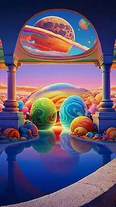 This wallpaper is like stepping into a cartoon dream! Imagine waking up in this wacky world, surrounded by giant, colorful orbs that look like they’re straight out of a video game. There’s a giant moon with rings hanging in the sky, and a pool of water that reflects all the crazy colors. It’s like someone took a bunch of crayons and smushed them together to make this super cool scene.