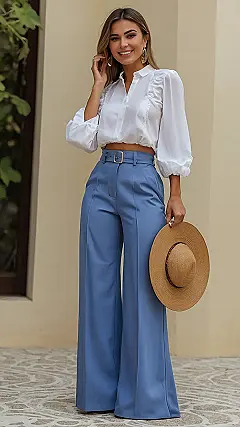 Want to look like you just stepped off a movie set, even if you’re just heading to the mall? This outfit is it! The light blue top is like a cloud on a sunny day, and the white pants are ready for anything, whether it’s grabbing ice cream or posing for Insta pics. Best of all, you don’t have to try hard to look cool; it just happens when you put this outfit on.