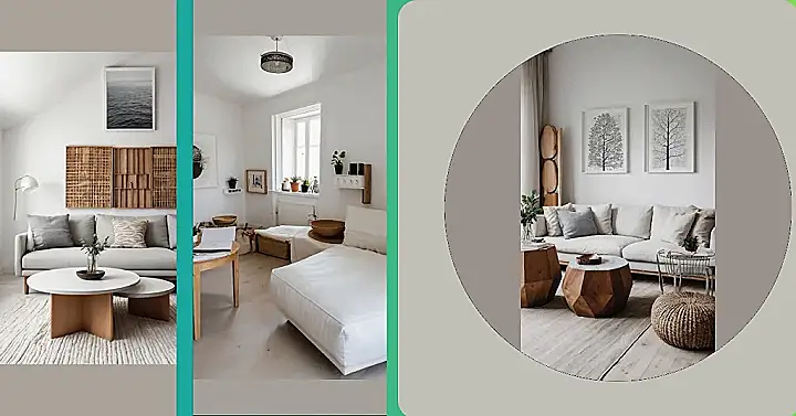 This living room is like a breath of fresh air! It’s all about clean lines, natural materials, and a calming color palette. Those sleek, minimalist art prints of trees just scream “Scandinavia” – like they’re straight out of a cozy cabin in the woods. And the comfy-looking couch, the chunky wooden coffee table, and that woven ottoman just make you want to curl up with a good book and a hot cup of cocoa (or maybe a glass of something stronger, if you’re feeling fancy).