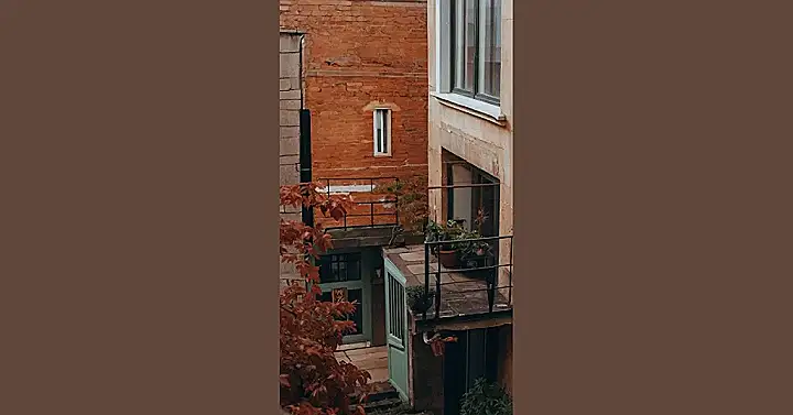This photo is like a peek into a secret garden! It’s like a little slice of peacefulness hidden away in the middle of a bustling city. The rusty red brick wall looks super old, and the little window in it is like a tiny eye looking out at the world. The balcony is cute, and I bet it would be the perfect spot to sip some tea and watch the city go by. Imagine how cozy it would be to relax on that balcony in the evening, with the city lights twinkling below!