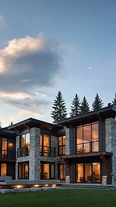 The house itself is sleek and modern, with big windows that let in tons of natural light. It looks super cozy and inviting, like a place where you could curl up with a good book and forget about your worries. And those windows are just begging for you to have a good view of the surrounding mountains and the lake. This place is like a dream home, perfect for someone who loves nature and wants to live a simple, peaceful life.