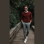 This guy’s got the classic men’s clothing style down pat! He’s rocking a maroon sweater, grey pants, and crisp white sneakers. It’s a look that’s been around for ages, but it still looks fresh and stylish. He’s like a walking example of how you can wear classic pieces and still look totally cool. Even with those trendy sunglasses, he still looks put together and confident – like he’s totally got this whole “adulting” thing figured out.
