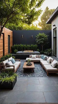 This picture shows a backyard layout so comfy it practically screams, “Put your feet up and forget homework exists!” Seriously, those couches look like cloud magnets, perfect for binge-watching shows outside (maybe not practical, but hey, dreams!) or just staring at the leaves and pretending you’re a nature expert. It’s all about how they arranged everything – seating here, plants there, shiny lights on the wall – proving that a smart backyard layout isn’t just about looking fancy, it’s about creating the ultimate hangout spot where the only drama is whether you brought enough snacks.