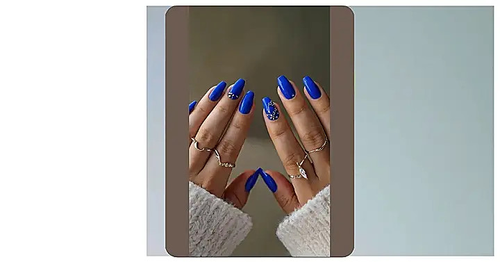 The image shows a hand with perfectly manicured nails painted a deep, rich blue. It’s like a little piece of the night sky on each finger! The blue color is so vibrant and shiny, it almost looks like you could see your reflection in it. This blue nail polish is seriously making a statement – it’s saying, “Hey, look at me, I’m cool and confident, and I’m not afraid to stand out!” It’s the kind of look that’s perfect for a night out with friends or even just a casual day at school.
