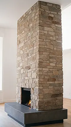 Wow, check out this living room fireplace! It’s not just a cozy spot; it looks like a solid chunk of a mountain decided to move indoors and start a heating business. Forget trying to hang a tiny picture above this thing, you might need a whole mural just to match its vibe. This stone giant is basically telling all other furniture to sit down and be quiet because *it* is the main event, ready to blast you with warmth until you’re perfectly roasted, just like a giant marshmallow.