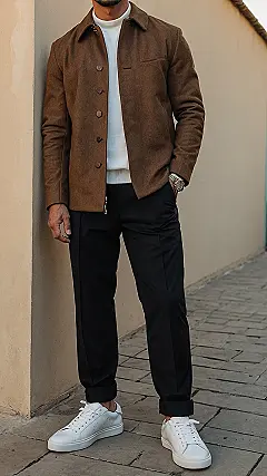 Now, look at the guy in the picture, he’s basically a smart casual superhero. That brown jacket is like the cooler, more laid-back version of a blazer, and pairing it with a simple white sweater keeps things from getting too serious. The black pants and clean white sneakers are the secret sauce – they make it look put-together but still totally chill. It’s the kind of outfit that says you could go grab pizza or suddenly attend a semi-important meeting without needing to change. Plus, white sneakers automatically add a touch of “I know what’s up” to any look, even if you don’t actually know what’s up.