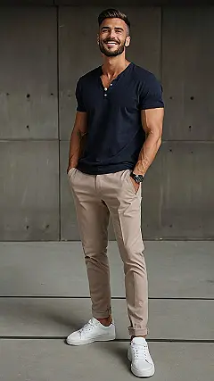Looking for that “effortlessly cool” vibe? This guy’s got it nailed. It’s like he just rolled out of bed, but somehow managed to find the perfect combo of polo shirt, chinos, and crisp white sneakers. It’s the kind of outfit that says, “Yeah, I’m stylish, but I also know how to chill.” Plus, that smile could probably sell ice to an Eskimo, so bonus points for charisma!