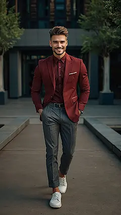 So, you want to look like you just stepped out of a magazine, huh? This dude’s got the secret sauce: a blazer that screams “I’m important, but also down to grab pizza,” paired with those super comfy-looking grey pants. And those white sneakers? It’s like saying, “Yeah, I could wear dress shoes, but I choose comfort and style.” It is the look that says “I’m ready for a board meeting but could totally crush it at the skatepark too.”