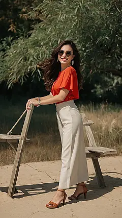 That orange top is screaming, “Summer!” It’s like a wearable sunset, perfect for chilling with friends or grabbing a smoothie after school. The cream pants give off a super classy but comfy vibe, kind of like when you dress up but secretly want to wear your pajamas. Ditch the heels if you’re actually going to, you know, sit on that kinda shaky looking chair though!