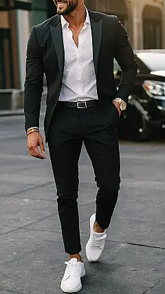 This guy is rocking the “formal, but make it fashion” look! He’s got a sleek black suit, a crisp white shirt, and those super cool white sneakers. It’s like he said, “I’m here to impress, but I’m also here to be comfortable.” Talk about a winning combo! It’s like he’s going to a fancy party, but he’s still ready to hit the dance floor!