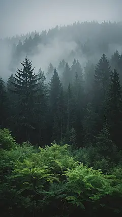 This picture is like stepping into a fairytale. Imagine a misty forest filled with tall, pointy pine trees, all hidden in a sea of swirling fog. You can almost hear the quiet rustle of leaves and the soft whispers of the wind through the trees. It looks like a place where magical creatures could hide, and maybe even a friendly dragon or two!