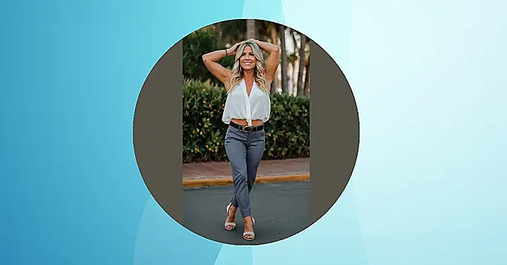 These aren’t your grandma’s pants, even though they might be your mom’s! This look proves that “mom pants” can be seriously stylish. The bright blue color is eye-catching, and the way she paired them with a classic white shirt and heels is totally on point. It’s like the ultimate power-casual look for conquering parent-teacher conferences or just grabbing groceries in style.