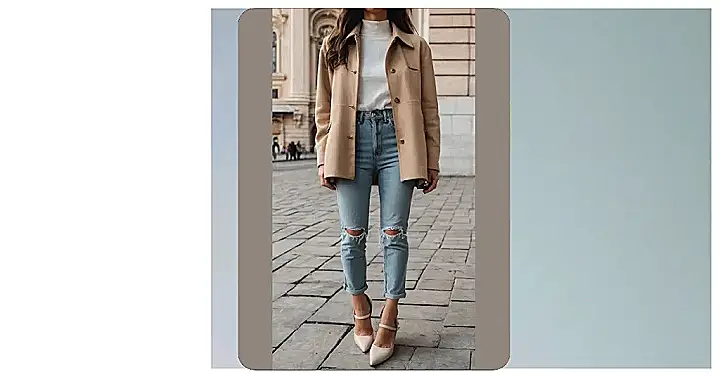 This outfit is a classic fall look, perfect for strolling through the crisp air and enjoying the changing colors of the leaves. The light brown jacket gives you that extra warmth without feeling too bulky, while the ripped jeans are super trendy and add a little bit of edge to your look. And those heels? They’re just the right amount of dressy to elevate your outfit from casual to chic. Just be careful not to trip on those ripped knees!