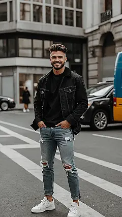 Pulling on a pair of black ripped jeans like these with a cool jacket and sneakers is like instantly upgrading your look from “just okay” to “where’d he get that?” It’s the go-to uniform for looking sharp without looking like you’re trying too hard. This kind of simple, cool men’s streetwear outfit just feels easy and ready for whatever the day throws at you, whether it’s hitting the skate park or just hanging with friends.