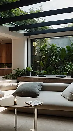 Imagine waking up in the morning and seeing the sun peeking through a glass ceiling, illuminating your living room with the warmth of nature. It’s like having a giant, natural skylight above your head, but with a touch of modern sophistication. This living space takes “Nature Living Spaces” to a whole new level, merging the indoor and outdoor experience in a way that’s both calming and energizing.