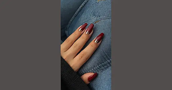 This picture shows some super chic nails! The dark red color is totally on-trend right now. It’s like wearing a little bit of autumn on your fingertips. The nails are long and pointy, which is a popular style that makes your hands look elegant and sophisticated. It’s almost like they’re saying “Hey, look at me, I’m stylish and cool!”