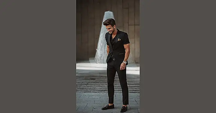 The guy in the picture totally rocks this level-up look. His black suit is classic, but check out those rolled sleeves and the slightly open collar – it makes him look cool and relaxed, not like he’s about to attend a board meeting. Plus, that smile says ‘I look good and I know it!’ It’s all about finding that sweet spot where you feel confident and ready for whatever fun the night throws at you, whether it’s mingling or showing off your questionable dance moves.