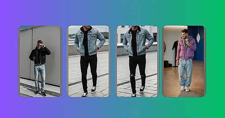 But it’s not just the jeans! Throw on a bright jacket, a cool scarf, and some crisp sneakers, and suddenly you’ve got the whole streetwear package. This look says you know what’s up without being too stuffy. It’s mixing bold colours with relaxed fits, like pairing that eye-catching purple puffer with these effortless ripped jeans. It shows that men’s streetwear isn’t just about following trends; it’s about creating a look that’s comfortable, confident, and maybe just a little bit playful.