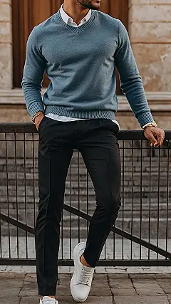 Check out this look: a cool blue sweater over a crisp white shirt? That’s like saying “I’m relaxed, but I also know how to iron.” Paired with those dark pants that aren’t jeans but aren’t stiff suit trousers either, it hits that perfect middle ground. And let’s talk about those white sneakers! They’re the secret weapon of smart casual – they make the whole thing feel laid-back instead of stuffy. It’s the kind of outfit that says, “Yeah, I cleaned up, but I’m still cool enough to hang.” Way better than wearing a full suit to grab pizza, unless that’s your vibe.