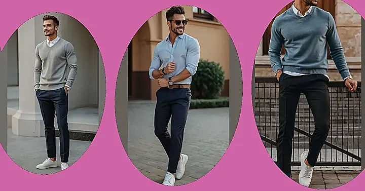 Check out this look: a cool blue sweater over a crisp white shirt? That’s like saying “I’m relaxed, but I also know how to iron.” Paired with those dark pants that aren’t jeans but aren’t stiff suit trousers either, it hits that perfect middle ground. And let’s talk about those white sneakers! They’re the secret weapon of smart casual – they make the whole thing feel laid-back instead of stuffy. It’s the kind of outfit that says, “Yeah, I cleaned up, but I’m still cool enough to hang.” Way better than wearing a full suit to grab pizza, unless that’s your vibe.