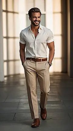 This dude’s rocking an outfit that’s been cool since your grandpa was chasing skirts! It’s like he raided a time capsule labeled “Classic Menswear” and decided to give it a modern twist. From the slightly unbuttoned shirt to the perfectly pressed khakis and shiny brown shoes, he’s proving that some styles never go out of fashion, they just get…hotter. Maybe it’s time to raid your own dad’s closet – you might find some hidden gems!