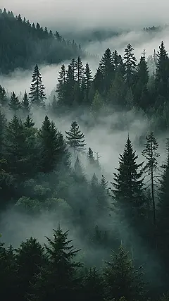 This picture is like stepping into a fairytale. Imagine a misty forest filled with tall, pointy pine trees, all hidden in a sea of swirling fog. You can almost hear the quiet rustle of leaves and the soft whispers of the wind through the trees. It looks like a place where magical creatures could hide, and maybe even a friendly dragon or two!