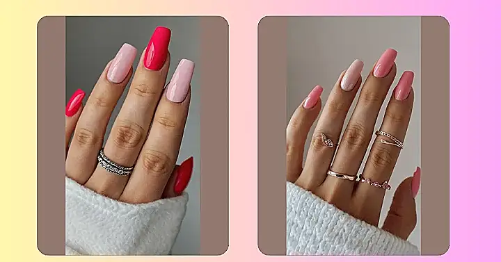 These nails are so cute, they’re practically begging for a pinky promise! You’ve got the softest pink and the boldest red, and those little sparkly rings add a touch of magic. Who needs a rainbow when you’ve got this awesome combo? These nails are like a party on your fingertips, and everyone’s invited!