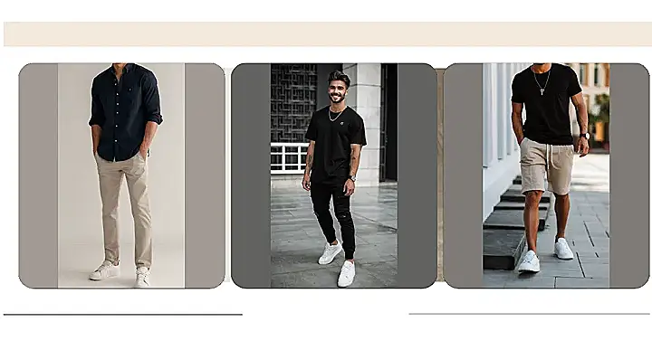 This guy’s outfit is basically the definition of “summer vibes.” He’s rocking a simple black tee that’s perfect for keeping cool in the heat, paired with some comfy khaki shorts that scream “beach day” (or, you know, just a casual walk around town). And let’s not forget those fresh white sneakers – they’re the perfect way to complete the look and make sure he’s ready to hit the streets in style.