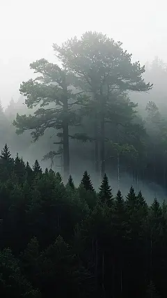 The image shows a misty forest, kind of like a scene from a fairy tale. The fog is so thick that it’s almost like a blanket covering the trees. You can barely see the tops of the trees, and it makes the whole thing feel mysterious and a little bit spooky. It’s like you’re walking through a scene from a movie where anything could happen!