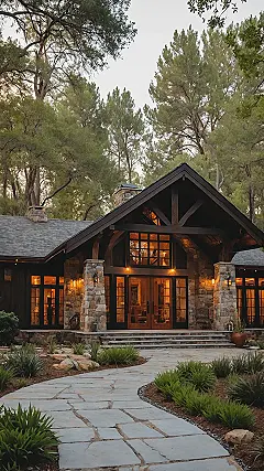 Check out this seriously cool ranch house exterior! It looks like it was built by a team of super-skilled squirrels who are also expert architects. All that stone and dark wood gives it this really strong, cozy vibe, like it’s giving you a big, welcoming hug. The glowing windows make you wonder what awesome stuff is happening inside – maybe a secret ninja training dojo or just someone eating cereal in their PJs, either way it looks inviting! This isn’t just a house; it’s a whole mood, surrounded by tall trees doing their best to look majestic.