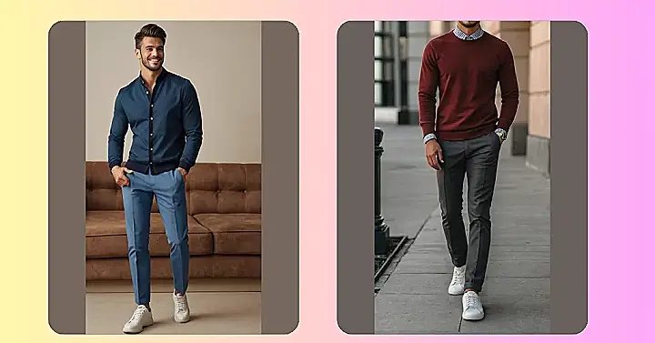 Hey there, fashion-forward friend! Check out this awesome outfit – it’s the perfect example of “men’s smart casual outfits.” See that burgundy sweater? It’s like a cozy hug for your torso, but way more stylish. Paired with those grey pants, it’s sophisticated but not stuffy, kind of like that cool teacher who secretly rocks a killer playlist. The white sneakers are the cherry on top – comfy enough for walking to school but polished enough for an after-school hangout. It’s all about looking good and feeling good, which is seriously important, right?