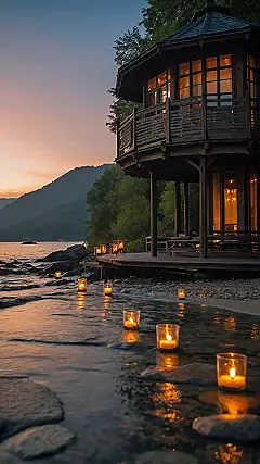 And seriously, look at that cool wooden building perched there! It’s like a secret hideout designed purely for max serenity points. Imagine just chilling on that deck, maybe with zero pop quizzes in sight, watching the sunset paint the sky while those little candles add to the peaceful glow down by the water. It’s the kind of tranquil escape that makes you want to ditch all your problems and just soak up the good vibes and maybe the sound of tiny waves lapping against the shore.