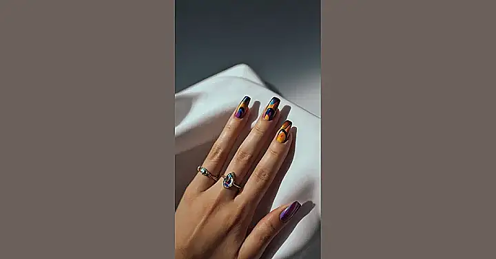 These nails are giving us major fall vibes without being too over-the-top. The cool, neutral colors like purple and blue mixed with pops of yellow and orange are like a walk through a colorful autumn forest. They’re subtle enough for everyday wear but still super trendy. You could totally pair these with a cozy sweater and pumpkin spice latte for the ultimate fall look!